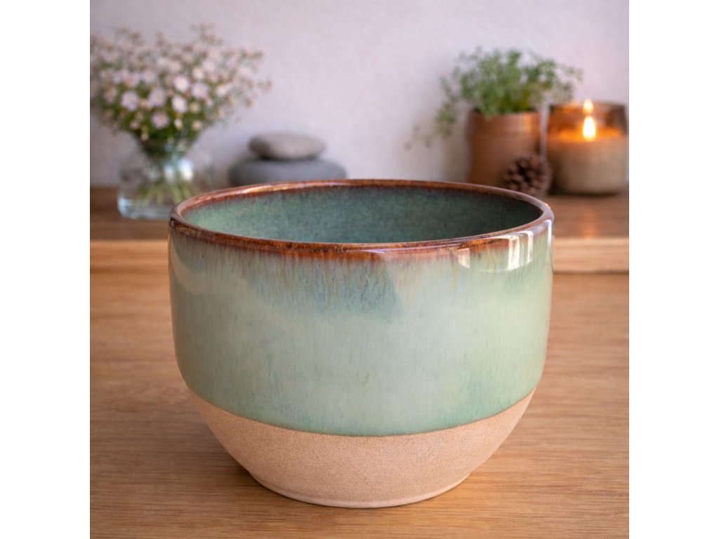 Nehrnek o objemu 200 ml s jemně nepravidelným tvarem, který příjemně padne do ruky. Glazura Laguna má světlý zelený odstín s přirozenou proměnlivostí povrchu.
