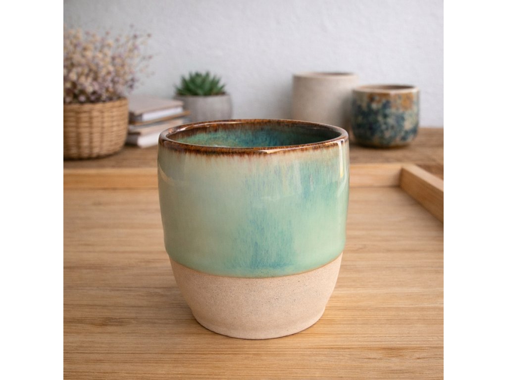 Nehrnek o objemu 90 ml s jemně nepravidelným tvarem, který příjemně padne do ruky. Glazura Laguna má světlý zelený odstín s přirozenou proměnlivostí povrchu.
